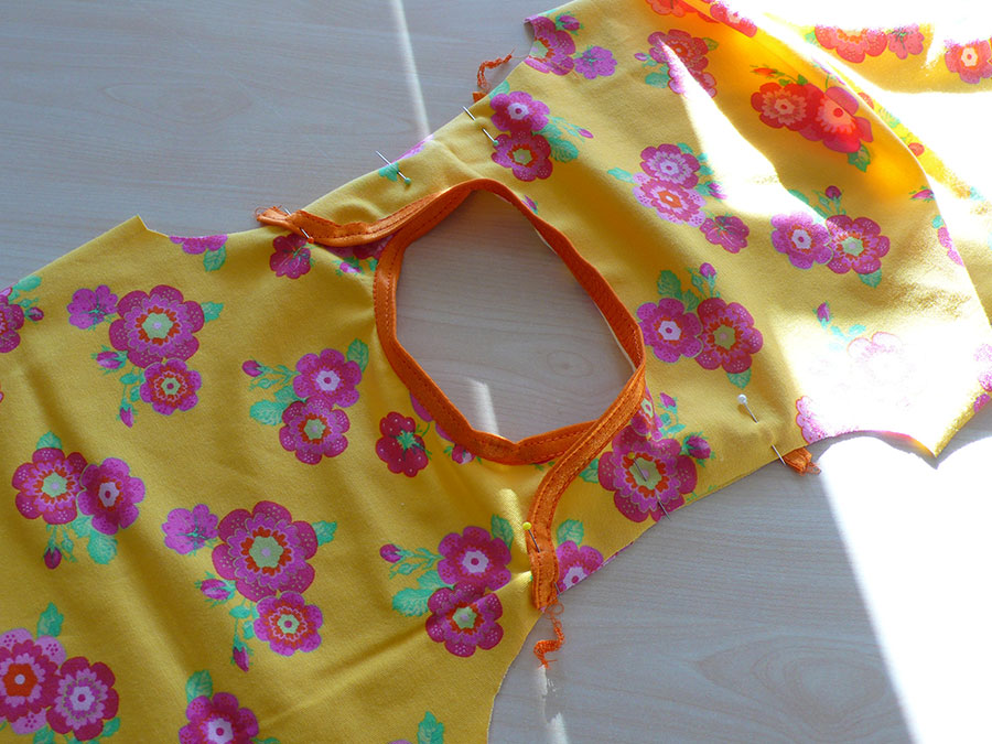 Nahtzugaben braucht es nur an den Kanten, die zusammengenäht werden. Am Halsausschnitt und am Beinausschnitt brauchen wir keine Nahtzugaben, da wir diese Kanten mit Falzgummi säumen werden.