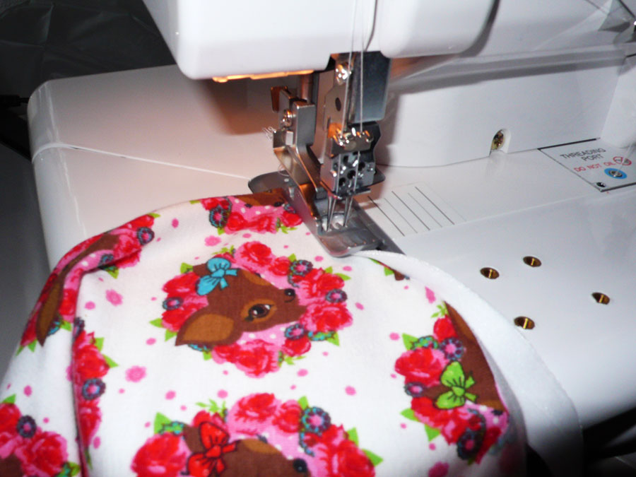 Der Gummi wird bei der Hälfte zusammengeklappt, die Stoffkante führt man im Falz. Beim Coverlock bitte darauf achten, dass ihr auf der rechten Seite des Stoffes nähen müsst — siehe Bild).