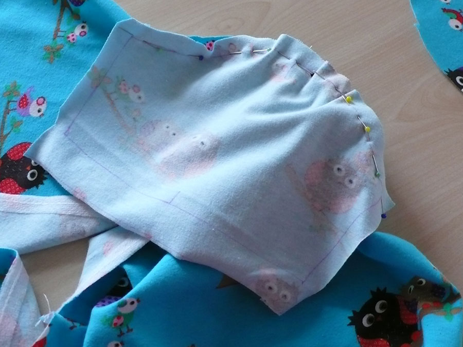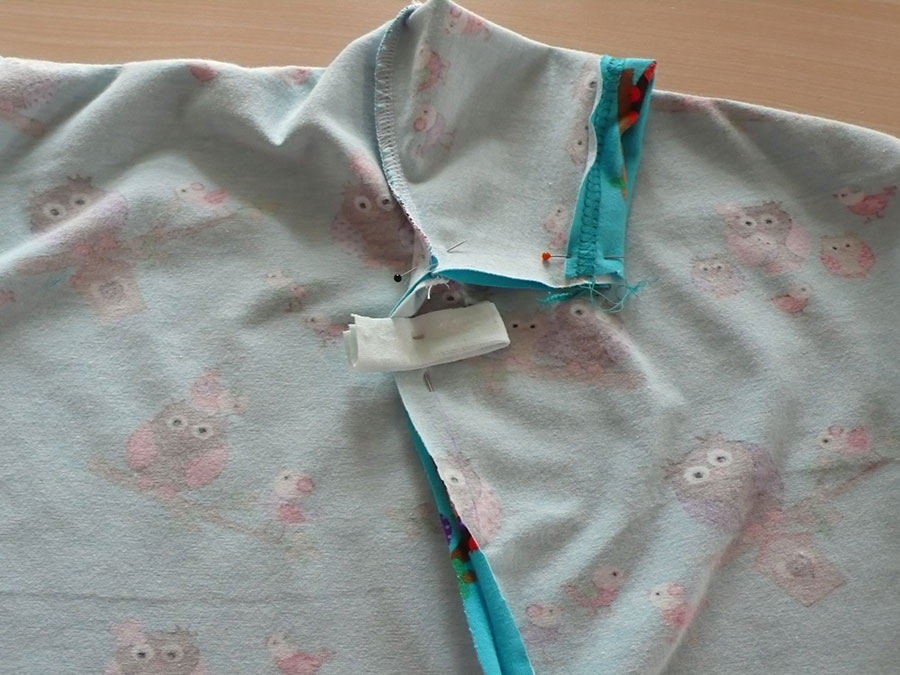 Die Seiten zusammenstecken, ein zusammengefaltetes Stück Stoff für den Druckknopf unter dem Achsel anbringen: