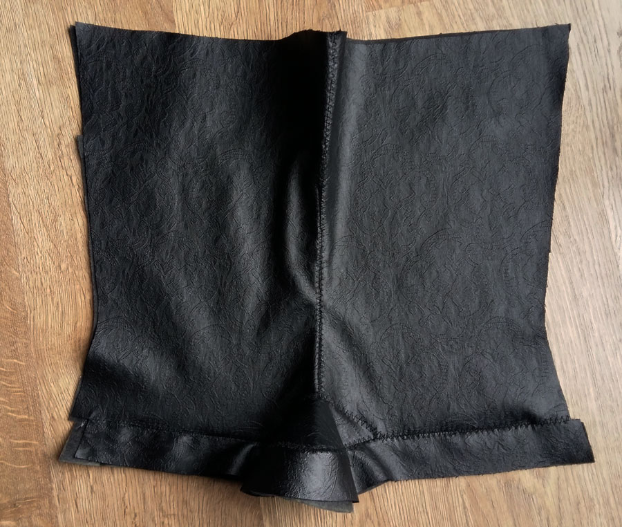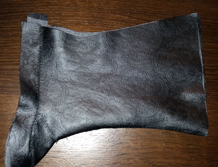 Zuerst nähen wir das Futter. Vielleicht ist euch aufgefallen, dass das "Bein" aus einem grossen Unterteil und einem schmalen Oberteil besteht. Das Oberteil wird am fertigen Stiefel nach aussen gekippt, muss also aus Oberstoff (Kunstleder), nicht aus Futter gefertigt werden. (Ich hatte ganz lässiges Kunstleder mit gemusterter Rückseite.)