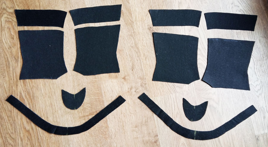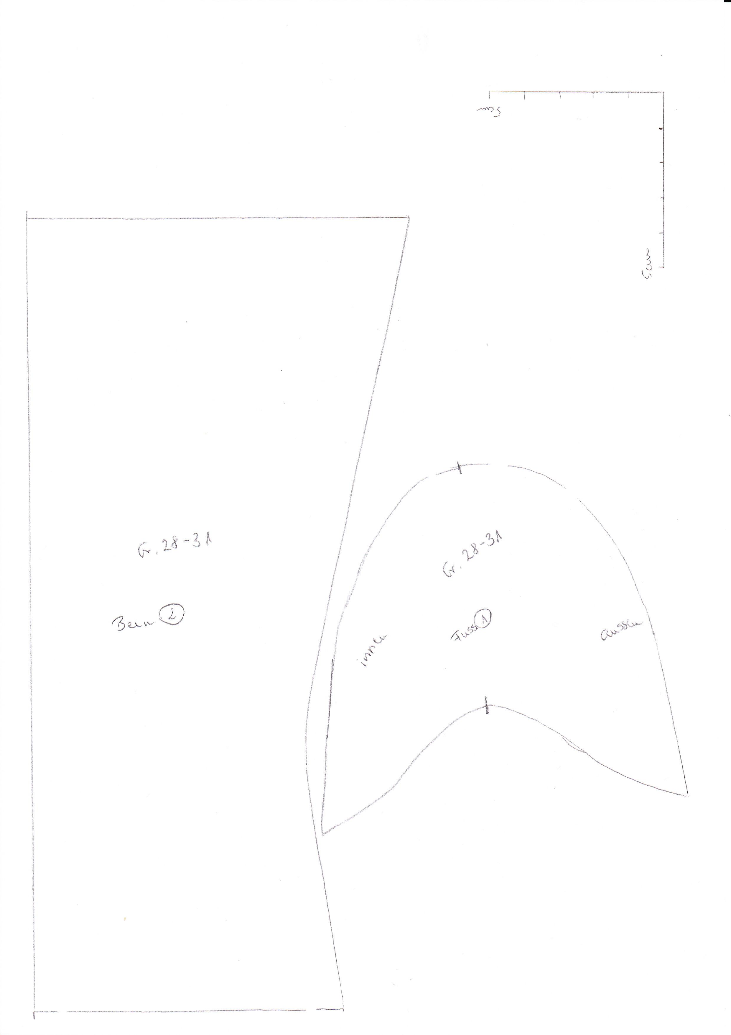 Das Futter ist fertig, jetzt kommt der Oberstoff. Die zwei Schnitte fürs Bein (Oberteil und Unterteil) könnt ihr zusammenkleben und so verwenden (siehe Bild). Es wird genauso genäht wie das Futter: