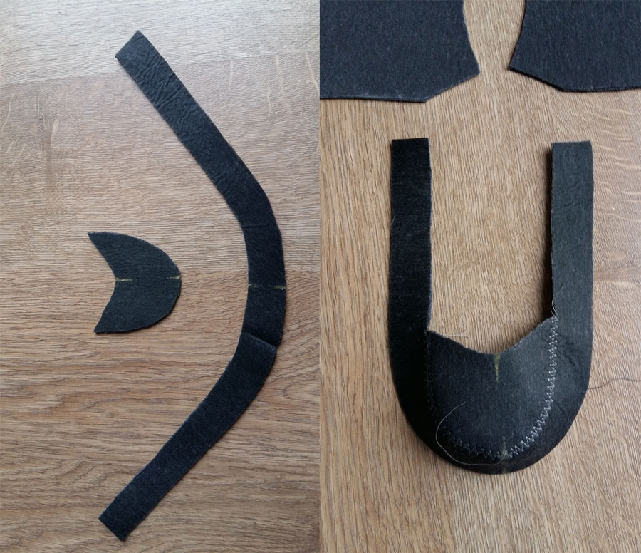 Teile ausschneiden (für beide Füsse): die Schnittteile brauchen keine Nahtzugaben, da sie nicht aus gewobenen Materialien sind. Wir nähen die Kanten mit einem 7 mm breiten 3-Step-Zickzack zusammen (die Kanten direkt nebeneinander legen und zusammensteppen)