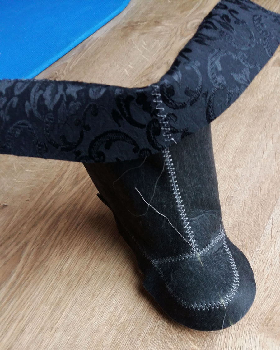 Bein und Fuss zusammensteppen. Hier könnt ihr die Naht gut erkennen, und auch, dass das Oberteil des Beins aus Oberstoff ist:
