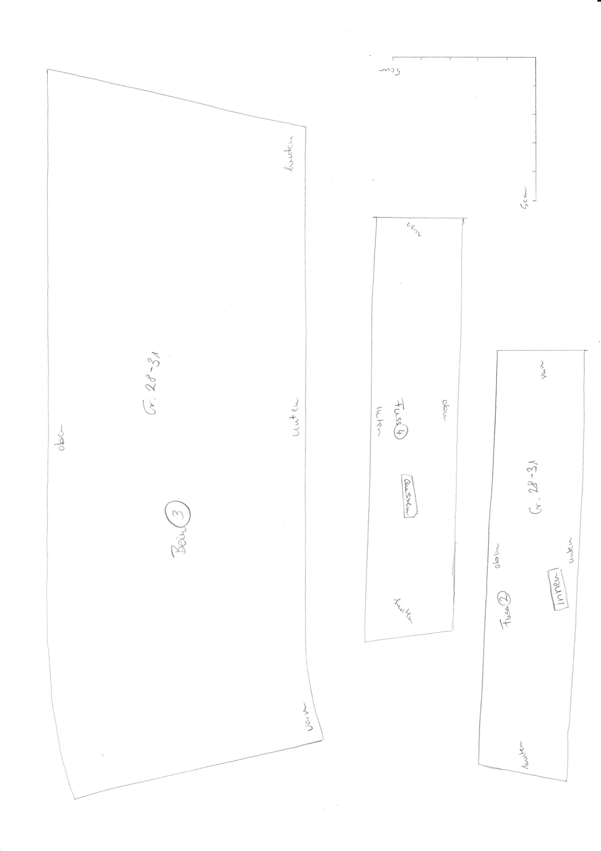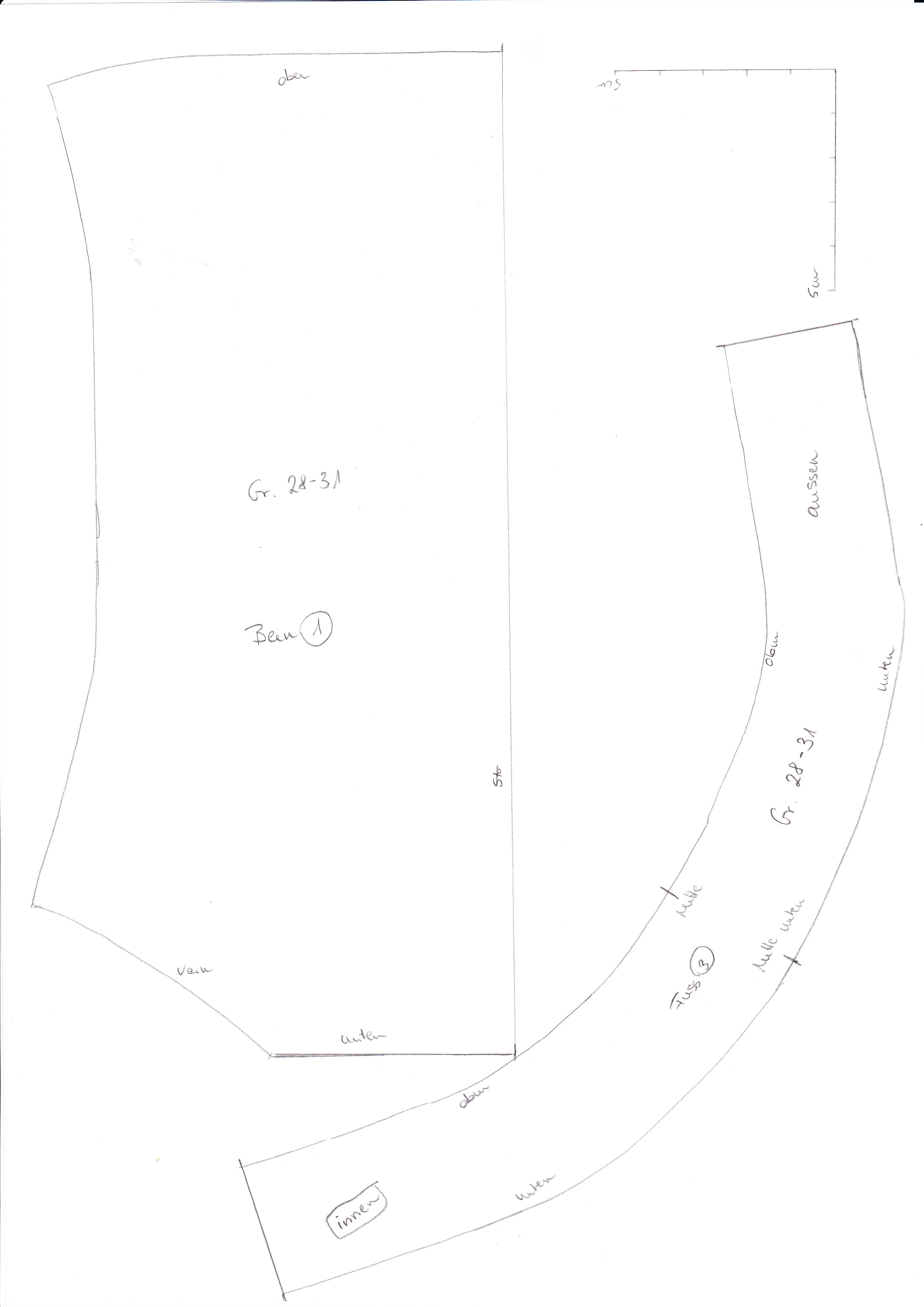 Gr. 28-31: das lange Fussteil besteht aus 3 Teilen: Nr. 2, 3 und 4. Die Reihenfolge, wie sie zusammengeklebt werden: "aussen (4)" kommt zu "aussen", "innen (2)" zu "innen" vom Mittelteil (3). Bein 1 und Bein 2 müssen an der geraden Kante zusammengeklebt werden.