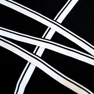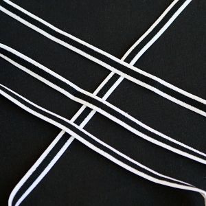 Butgetpackung Gummiband in weiss, gerippt, mittig mit zwei dünnen, schwarzen Streifen. Hauchdünne, sehr weiche Qualität für Unterwäsche und hautnahe Bekleidung.