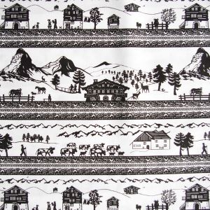 Baumwolle Popeline Stoff in weiss mit Scherenschnitt-Muster in schwarz. Der Stoff ist dünne Baumwolle Webware (nicht elastisch) mit wasserabweisender Beschichtung.